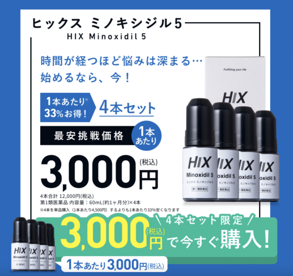 ヒックスミノキシジル5は「定期購入」ではなく、4本セット購入で大幅割引になります。