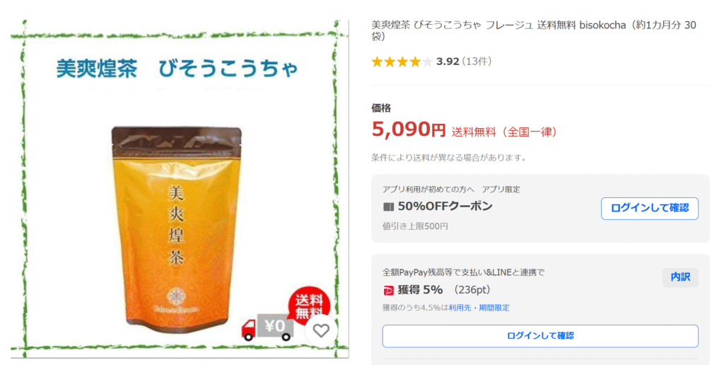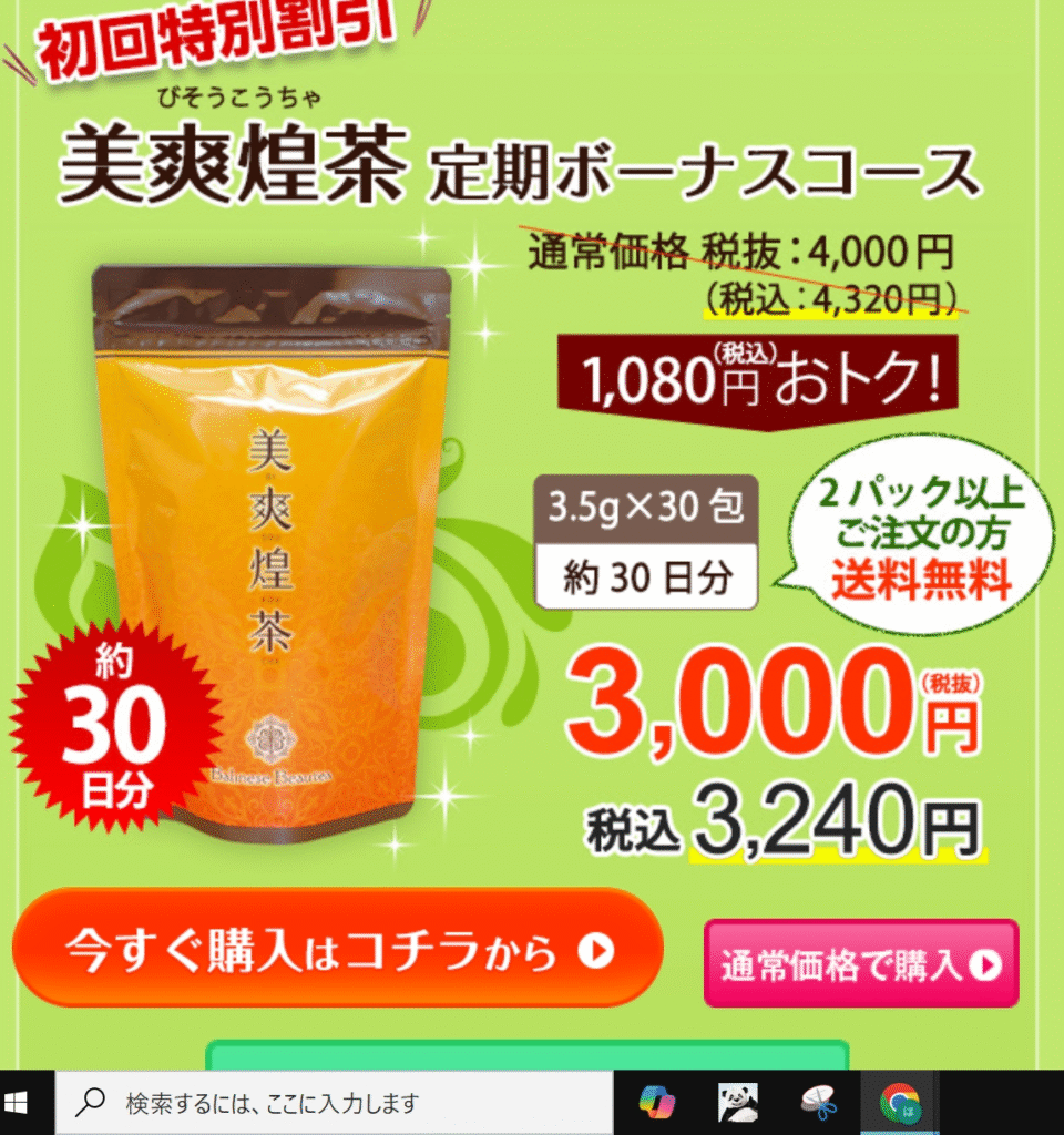 美爽煌茶は通常価格4,320円とやや高めですが、公式サイトでは初回限定の特別割引があり、3,200円(税込)で購入できます。